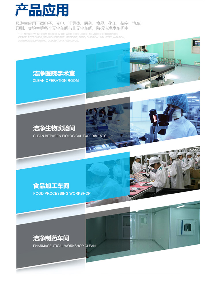 应用 : 风淋室应用于微电子、光电、半导体、医药、食品、化工、航空、汽车、印刷、实验室等各个无尘车间与非无尘车间、阶梯洁净度车间中